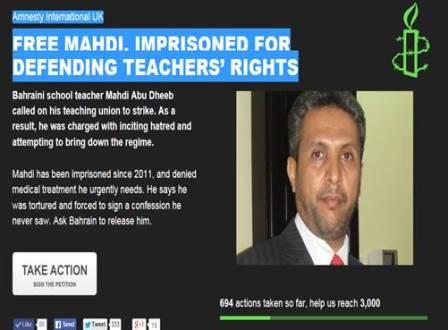 À l’occasion du 3ème anniversaire de l’arrestation de Mahdi Abu Dheeb, responsable du Bahreïn Teachers Association (BAT), l‘Internationale de l’Éducation (IE) a décidé de lancer une nouvelle campagne visant à réitérer l’appel à sa libération immédiate et inconditionnelle. L’IE a besoin, aujourd’hui et maintenant, de votre appui individuel pour exercer une action de solidarité mondiale et que cessent les conditions inhumaines de détention dans lesquelles cet enseignant responsable syndical croupit dans les geôles du Bahrein.