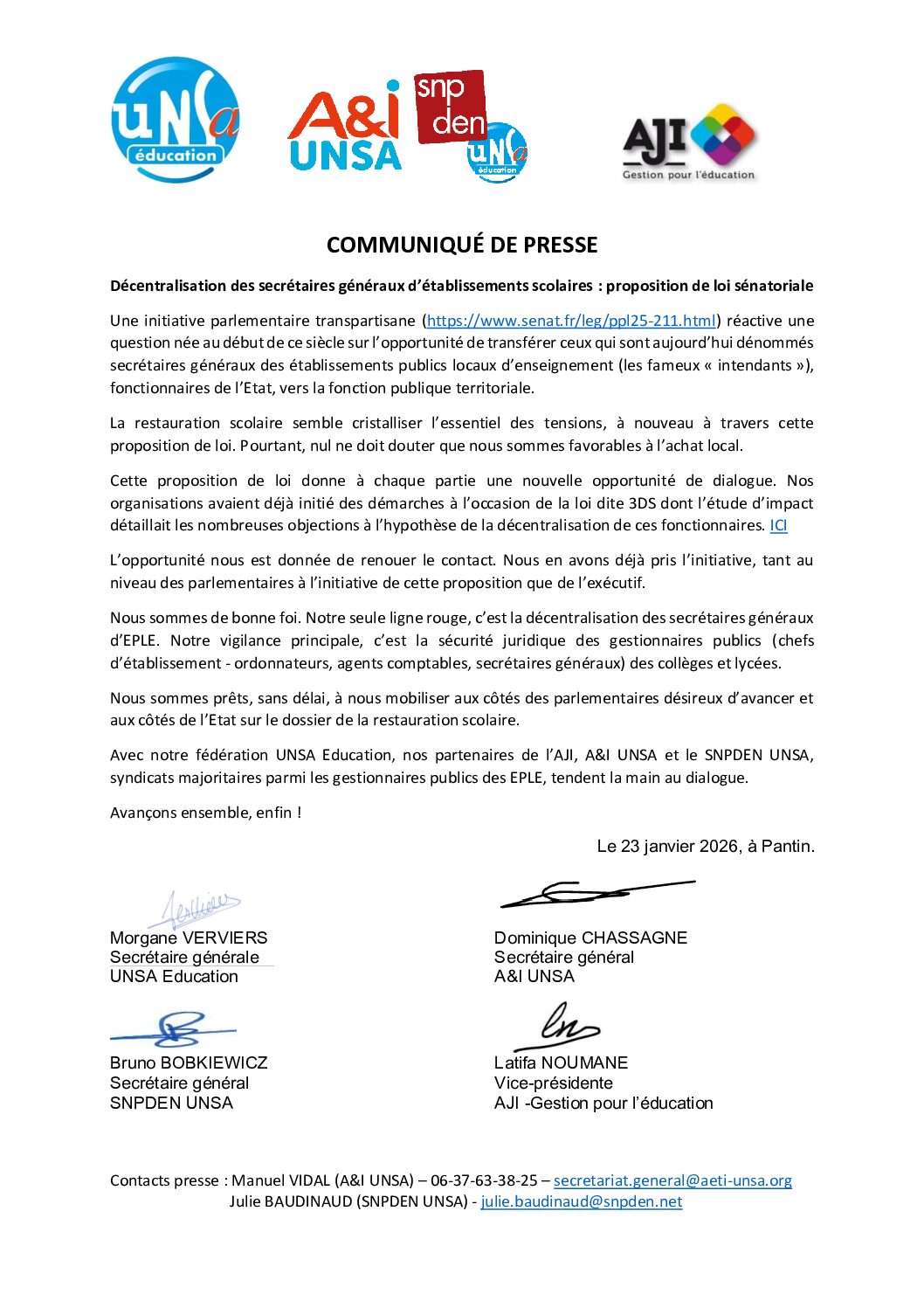 L’UNSA Éducation, ses syndicats A&I UNSA et SNPDEN UNSA ainsi que l’AJI (association professionnelle nationale des personnels d’intendance des établissements publics d’enseignement français) ont signé ensemble un communiqué de presse pour dénoncer l’article 5 de la proposition de loi sénatoriale « visant à mettre la commande publique au service de la souveraineté économique ».