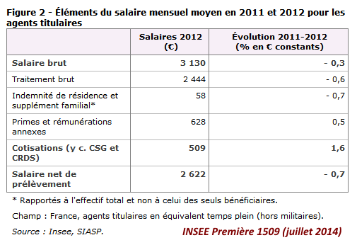 Les statistiques sont toujours recueillies et traitées en prenant «un certain temps». C’est donc le numéro 1509 d’INSEE Première (juillet 2014) qui établissait que les rémunérations des fonctionnaires de l’État avaient connu une baisse de 0,8% en euros constants.