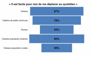 Pour ce qui est de la mobilité au quotidien, les jeunes ruraux des CP sont, comme on pouvait sy attendre, les plus impactés par leur situation géographique (voir graphique). La dépendance à d’autres personnes qui ont un véhicule, la faible fréquence des transports en commun et les temps de trajet très longs sont les principaux freins à leur mobilité.