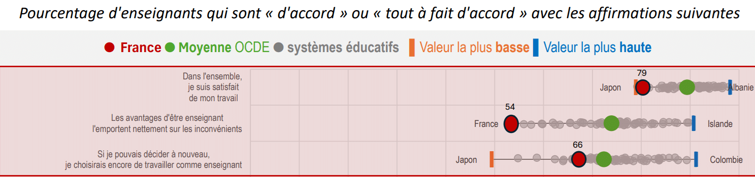 S’il est vrai que le choix de la profession d’enseignant est partout un choix de cœur et qu’une écrasante majorité déclarent ne pas regretter ce choix, la France détone sur un point : seulement 54% affirment que « les avantages d’être enseignant l’emportent nettement sur les inconvénients » ! (la moyenne de l’OCDE est à 73%). Ils sont également parmi les moins satisfaits de leur travail au sein de l’OCDE. La proportion des enseignants français qui regrettent d’avoir choisi ce métier progresse de 5 points.
