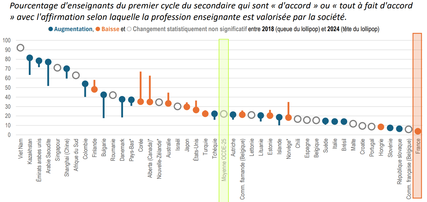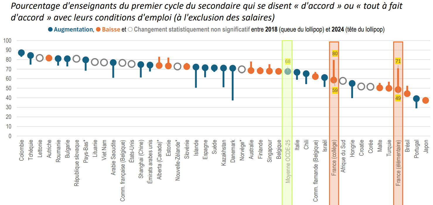40% des enseignants de l’OCDE se disent satisfaits de leur salaire. Et en France ? 27% seulement en collège et 22% au primaire. La dégradation des conditions de travail est également très forte en France. La chute de cet indicateur est plus forte chez nous que partout ailleurs au sein de l’OCDE (-20 points entre 2018 et 2024). C’est d’autant plus significatif que le salaire et les conditions de travail semblent s’améliorer dans de nombreux autres pays.