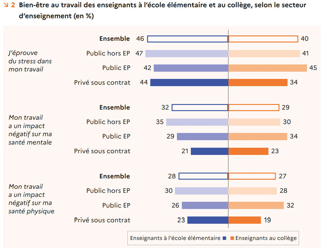 En France, 40% des enseignants au collège et 46% à l’école élémentaire déclarent éprouver « assez » ou « beaucoup » de stress dans leur travail. Les femmes sont plus concernées que les hommes. Si le nombre d’enseignants qui pensent que leur travail impacte leur santé physique ou mentale baisse, il reste dans des proportions élevées. Les enseignants du public qui semblent les moins impactés par le stress et ces conséquences sont en école élémentaire dans l’éducation prioritaire. Peut-on y voir la conséquence du dédoublement des classes ?