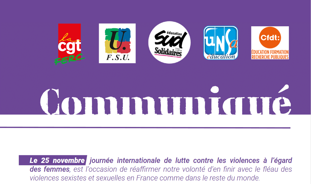 Chaque année, le 25 novembre, journée internationale de lutte contre les violences à l’égard des femmes, est l'occasion de réaffirmer notre soutien cette cause. Nous devons manifester avec force et conviction notre volonté d’en finir avec le fléau des violences sexistes et sexuelles en France comme dans le reste du monde. En France, une femme sur deux en a déjà subies, 8000 femmes sont victimes de viol par an pour ne citer que deux exemples. Alors que l'élection de Donald Trump libère les paroles sexistes et masculinistes, alors que les restrictions budgétaires menacent les dispositifs de lutte contre celles-ci, alors que le rôle de l'École, pourtant décisif pour leur détection et leur prise en charge est à consolider, les organisations syndicales : UNSA, FSU, FERC CGT, SUD, ET CFDT appellent à rejoindre toutes les actions et/ou les mobilisations organisées autour de la journée du 25 novembre. Soyons nombreuses et nombreux à nous mobiliser.