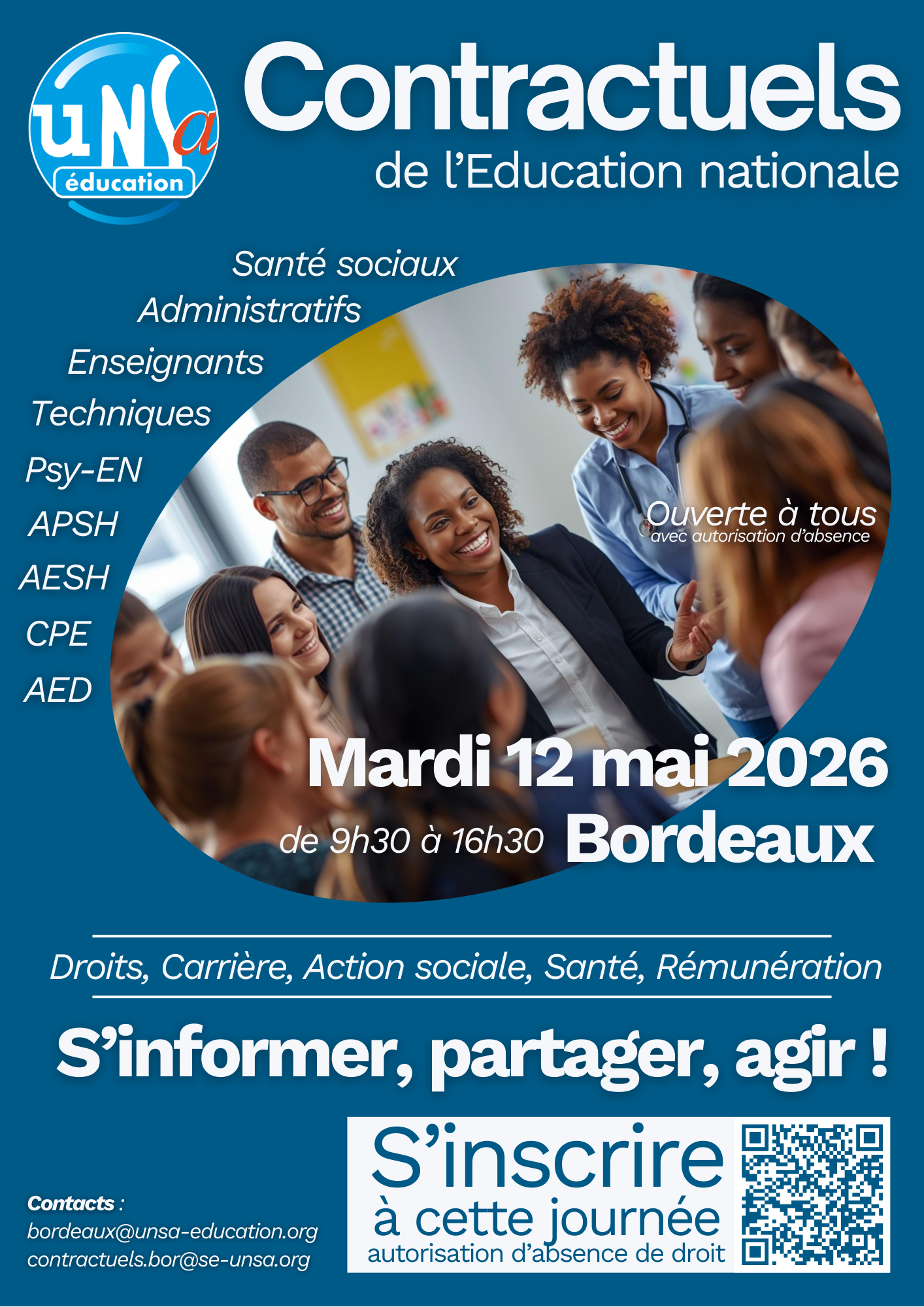 Cette journée de formation se déroulera à Bordeaux, mardi 12 mai 2026 de 9h30 à 16h30. Elle est ouverte à tous les personnels contractuels : enseignants, administratifs, AED, AESH, techniques, ainsi qu’aux personnels de santé et sociaux.
