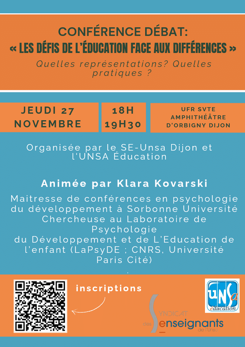 – Les défis de l’Education face aux différences à l’université Bourgogne Europe Dijon le jeudi 27 novembre à 18h, inscriptions ouvertes sur ce lien.