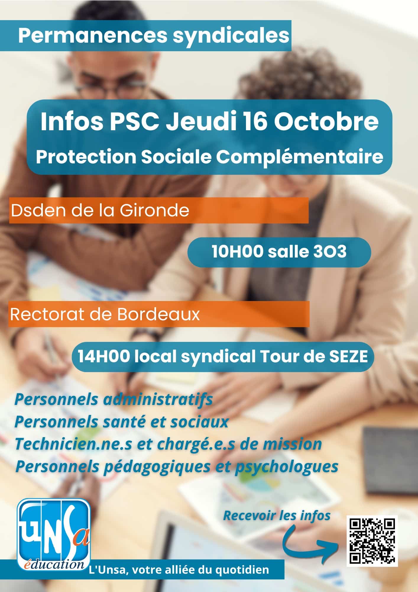 Les opérations d'affiliation de l'ensemble des collègues à la complémentaire santé du ministère sont en cours pour l'académie de Bordeaux. L'Unsa Education sera présente jeudi 16 octobre au Rectorat de Bordeaux (après midi) et à la Dsden 33 (matin) pour vous informer et vous accompagner dans les démarches de la nouvelle Protection Sociale Complémentaire (PSC)